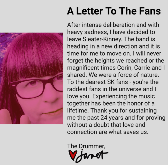 “We are saddened by Janet’s decision to leave Sleater-Kinney. It has been an incredible privilege to work with such a talented musician and drummer over the course of so many albums, including The Center Won’t Hold,” it reads.