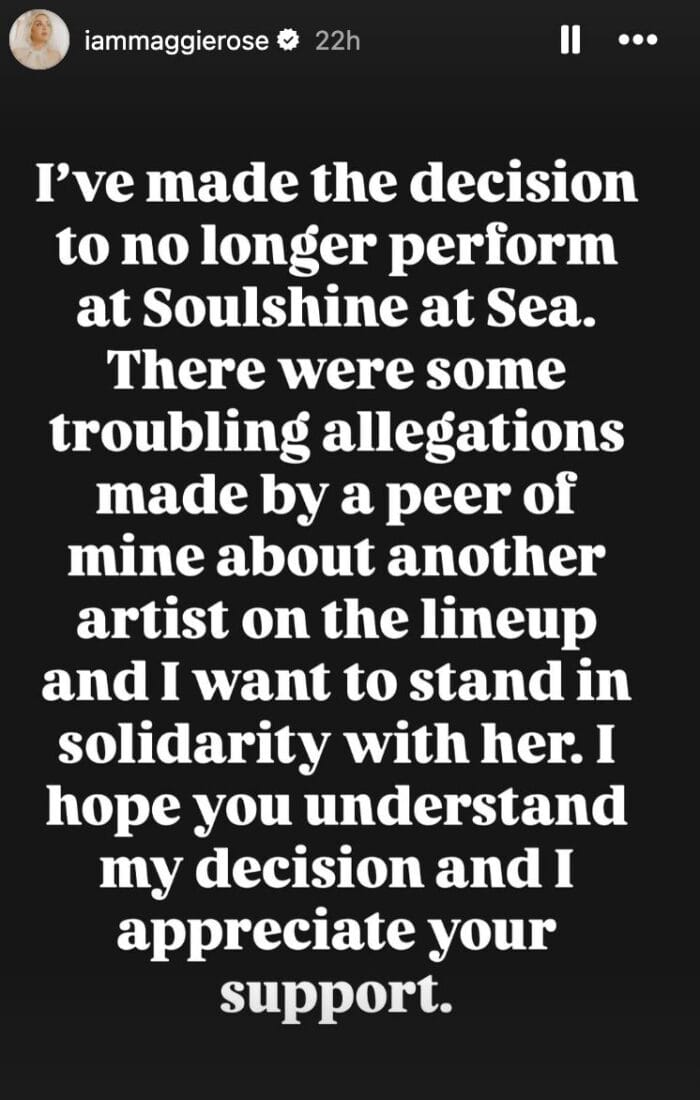 Maggie Rose continued the pattern, delivering her statement online and writing, in part, “There were some troubling allegations made by a peer of mine about another artist on the lineup and I want to stand in solidarity with her.”